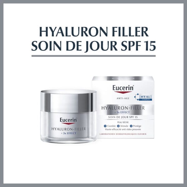 Eucerin Hyaluron Filler + 3x Effect Soin de Jour Peau Sèche SPF 15 est un soin anti-âge intensif conçu pour combler les rides, hydrater la peau en profondeur et prévenir leur réapparition. Enrichie en acide hyaluronique, saponine et enectine, cette formule à l’efficacité prouvée offre une triple action : elle comble, stimule et protège la peau tout en apportant le confort nécessaire aux peaux sèches. Le SPF 15 et la protection UVA contribuent à prévenir le vieillissement cutané induit par le soleil.